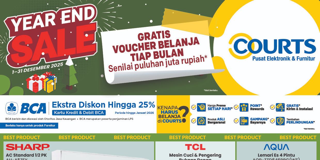 Penawaran berlaku di seluruh cabang COURTS Indonesia dari hari Senin, 1 Desember 2025 hingga hari Rabu, 31 Desember 2025.